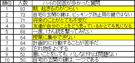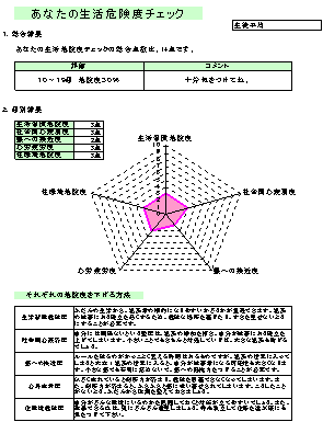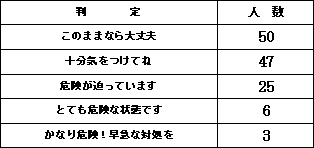 | この生活危険度測定は、「子どもの危険回避研究所」横矢所長のご厚意により実施することが出来ました。(横矢さんの著書「危険回避・被害防止トレーニング・テキスト」より引用) 同テキストに関心のある方または生活危険度測定を受けてみたい方は、上記ホームページをご利用するかPTA本部に相談してください。 |